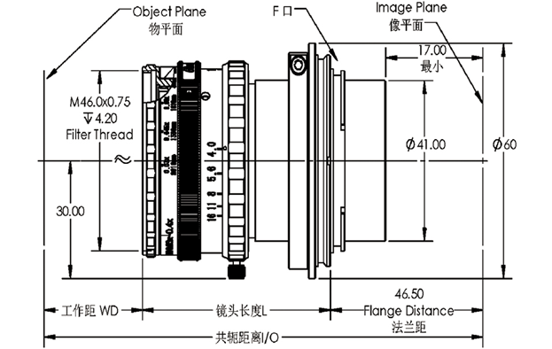 | 倍率(β) | 共軛距(I/0) | 工作距(WD) | 鏡頭長(zhǎng)度(L) | ?43.27視場(chǎng) |